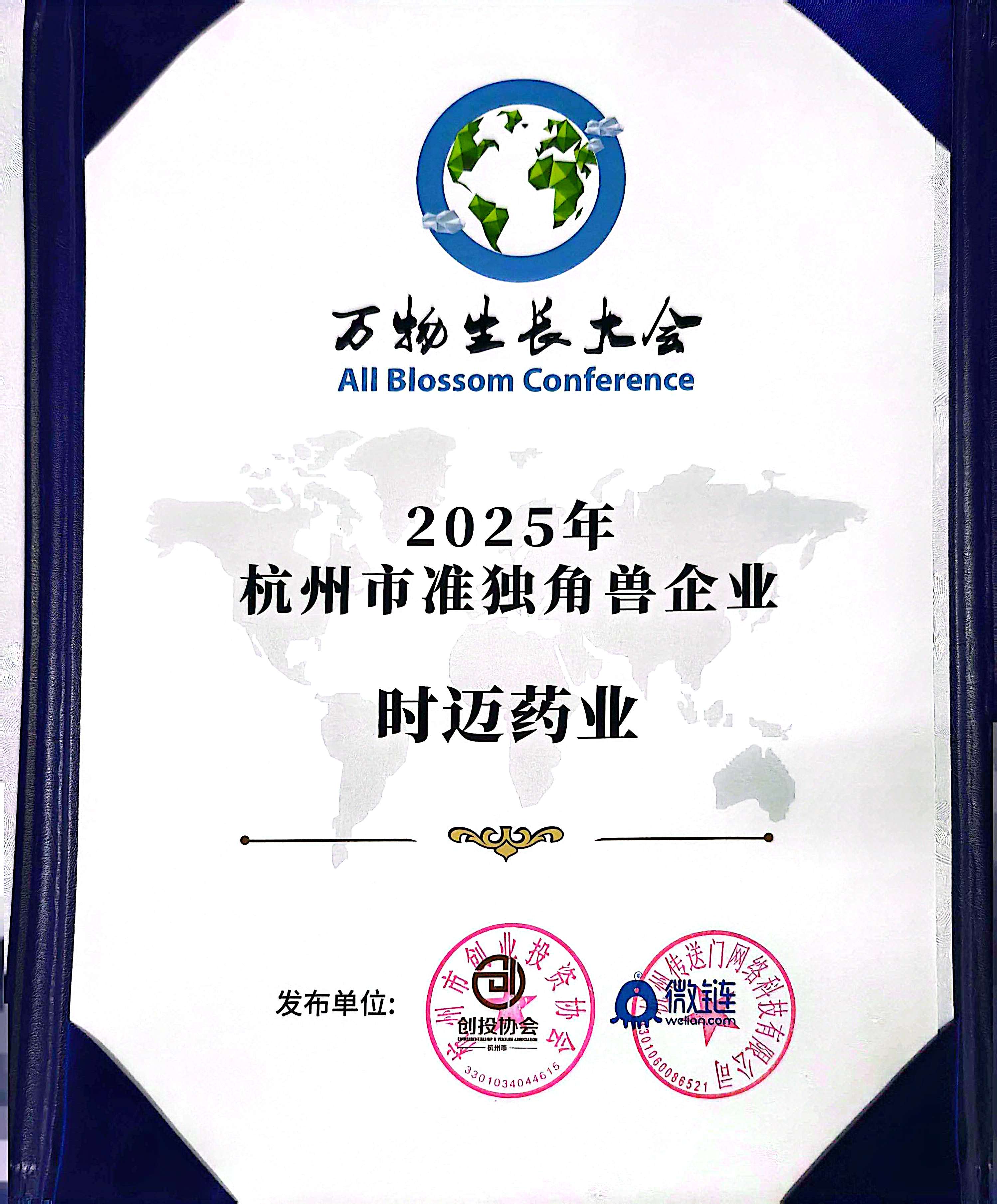 ? ? ? ?4月25日,由民建浙江省委會、浙江省工商聯(lián)、中國投資發(fā)展促進(jìn)會主辦的第九屆萬物生長大會·獨角獸之夜在杭州國際博覽中心召開。作為國家戰(zhàn)略新興產(chǎn)業(yè)和新質(zhì)生產(chǎn)力主陣地的生物醫(yī)藥產(chǎn)業(yè)中的創(chuàng)新實力企業(yè),時邁藥業(yè)在連續(xù)五年獲得“杭州準(zhǔn)獨角獸企業(yè)”稱號的基礎(chǔ)上,今年又入選“2025中國未來獨角獸TOP100”榜單,完成躍升。