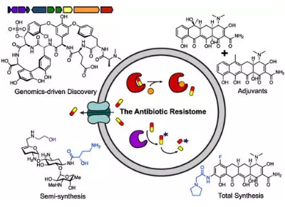 圖5:探索β-內(nèi)酰胺酶的靶點(diǎn)加速針對(duì)抗耐藥藥物的研究?Chemical Reviews ? ? ? Gerard D. Wright及其同事通過抗生素耐藥組或賦予耐藥性的所有遺傳成分的集合來觀察抗生素抗藥性。他們著眼于兩類抗生素,氨基糖苷類和四環(huán)素類,并描述了對(duì)每類抗生素產(chǎn)生耐藥性的機(jī)制。通過這種系統(tǒng)方法,可以了解外排泵,修飾酶和目標(biāo)修飾物如何改變抗生素的功效。這些機(jī)制不僅允許細(xì)菌破壞治療手段,而且還是細(xì)菌相互競爭并相互保護(hù)的機(jī)制。他們提出了利用細(xì)菌合成機(jī)制的抗藥性指導(dǎo)的抗生素發(fā)現(xiàn)模型(圖6)。 詳細(xì)文章參照:https://pubs.acs.org/doi/10.1021/acs.chemrev.0c01214