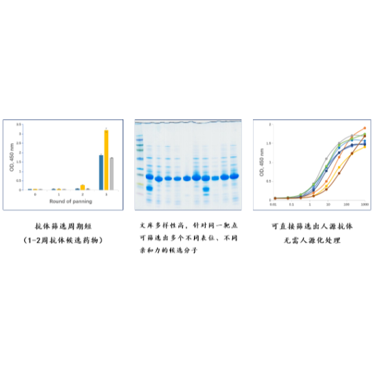 4 ultra-large human IgM libraries: Fab and dAb formats with industry-leading diversity and rapid screening cycles (1–2 weeks). dAb capabilities are extremely rare globally.Advantages:High epitope diversity and affinity flexibilityFully human antibodies—no humanization neededRapid candidate generationAnimal immune libraries: Proprietary hybridoma + phage display platforms for mouse, rabbit, and monkey. Enable broader epitope coverage and higher-quality antibodies. -